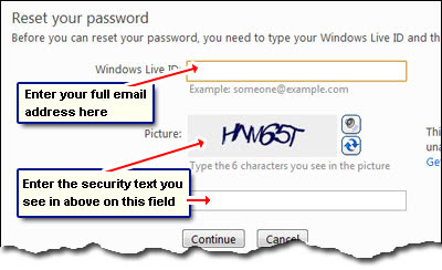 You will come to reset your password screen - below. Enter your Windows Live ID (email address in full) followed wavy characters shown in the image (CAPTCHA) and then click "Continue".